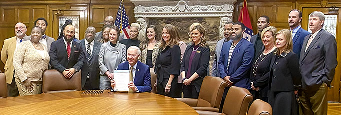 The Sixth Division staff, Judge Brown, and former Governor Asa Hutchinson are all smiles at the bill signing to increase juvenile officer reimbursement.