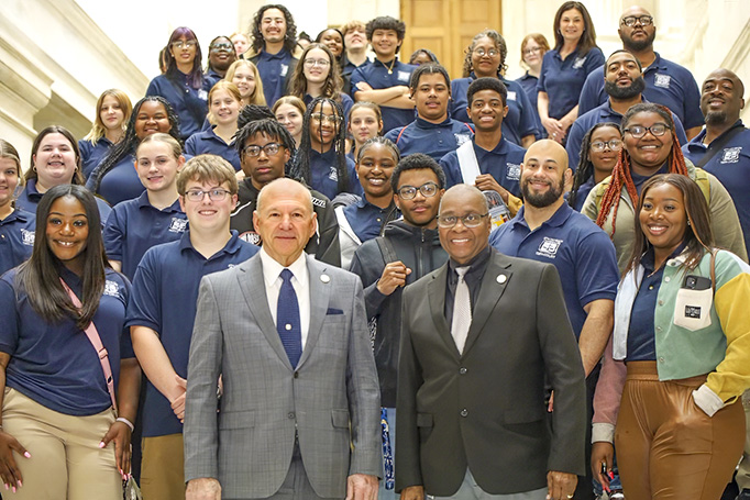 State Representatives Mike Holcomb, front, left; and Ken Ferguson, right, front, join teen court students at the Arkansas State Capitol.