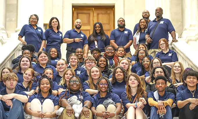Teen Court students and staff strike a smiling pose on the stairs leading to the entrance of the House of Representatives Chamber at the State Capitol .